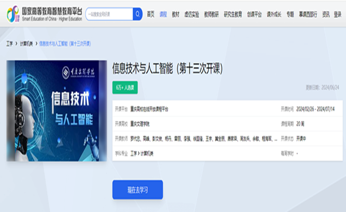 《信息技术基础》是数学与人工智能学院计算机类专业必修课程,重庆市高校精品在线开放课程、重庆市线上线下混合式一流课程,重庆市课程思政示范课程,课程案例荣获重庆市高校一流本科课程示范案例、重庆市高校在线课程建设与应用优秀示范案例、全国高校在线开放课程联盟联席会“慕课十年典型案例”。课程线上资源累计选课60000余人,课程入选国家高等教育智慧教育平台、入选智慧教育平台 “川渝教学资源共享专区”。